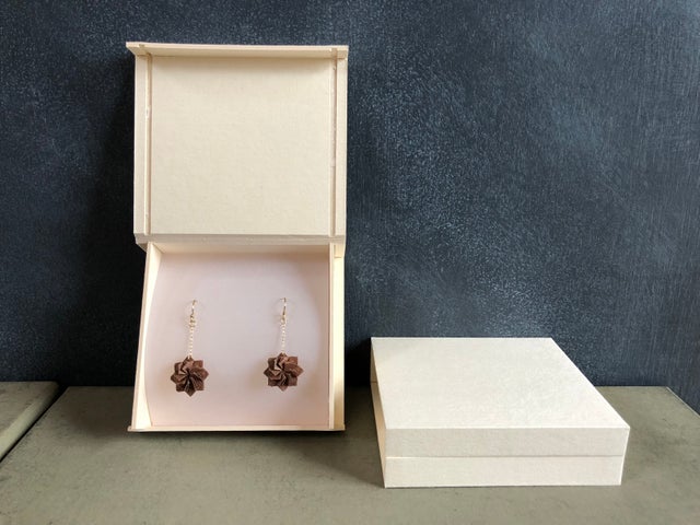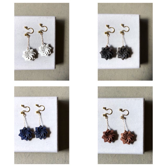 ※イヤリングは4色からお選びいただけます(お任せも賜ります)/柿渋や顔料で染めた黒谷和紙(京都府指定無形文化財)修行したハタノワタルの和紙です