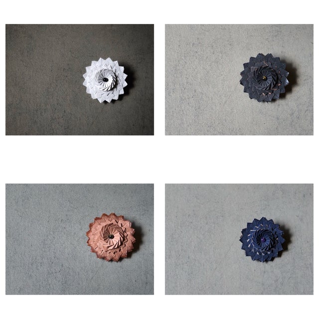 ※ブローチは4色からお選びいただけます(お任せも賜ります)/柿渋や顔料で染めた黒谷和紙(京都府指定無形文化財)修行したハタノワタルの和紙です