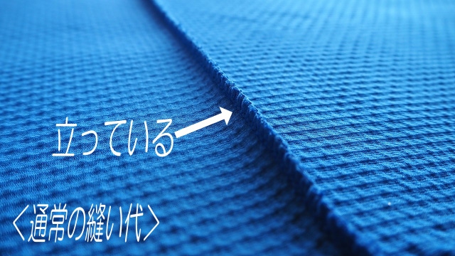 服の内側にある、各パーツ同士の接ぎ目の事を「縫い代」と言います。通常の縫製ですと下写真のように縫い代が立ってしまうのですが、当製品では「マタギ2本針裏振り」という縫い方で各パーツを接ぎ合わせています。その理由は、立った縫い代が肌に当たってゴロつくのを防ぐ為です。この縫い方をする事によって、縫い代が潰れてややフラットな状態になるため肌当たり(=着心地)が良くなります。