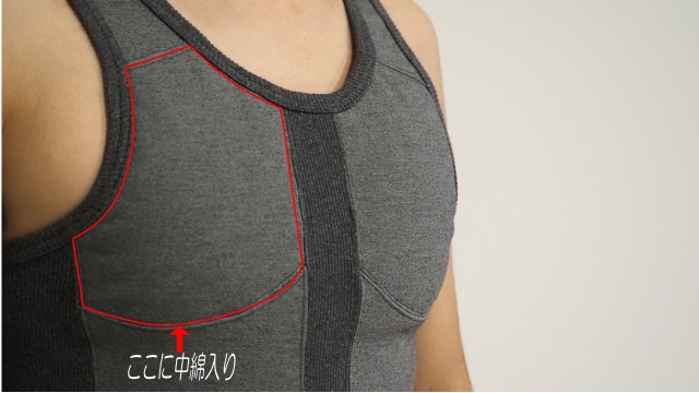 ただし、過度に胸板をモッコリさせておおげさに体型を偽るような製品は作りたくありません。あくまでも程良い隆起具合(約5mmほど)にこだわり、筋トレした後のパンプアップした状態の胸板をイメージして中綿の厚みを調整しました。