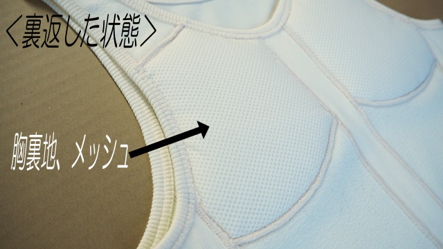 中綿が入っている胸部分の裏地面(肌に当たる面)には柔らかいメッシュ生地を使用しました。これは①着用時の胸部分への圧迫感を防ぐ為、②中綿部分の通気性を良くする為、③洗濯後に中綿部分を乾きやすくする為、という3つの意味があります。