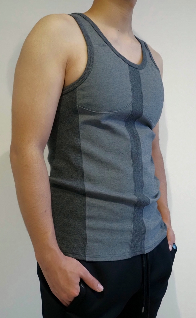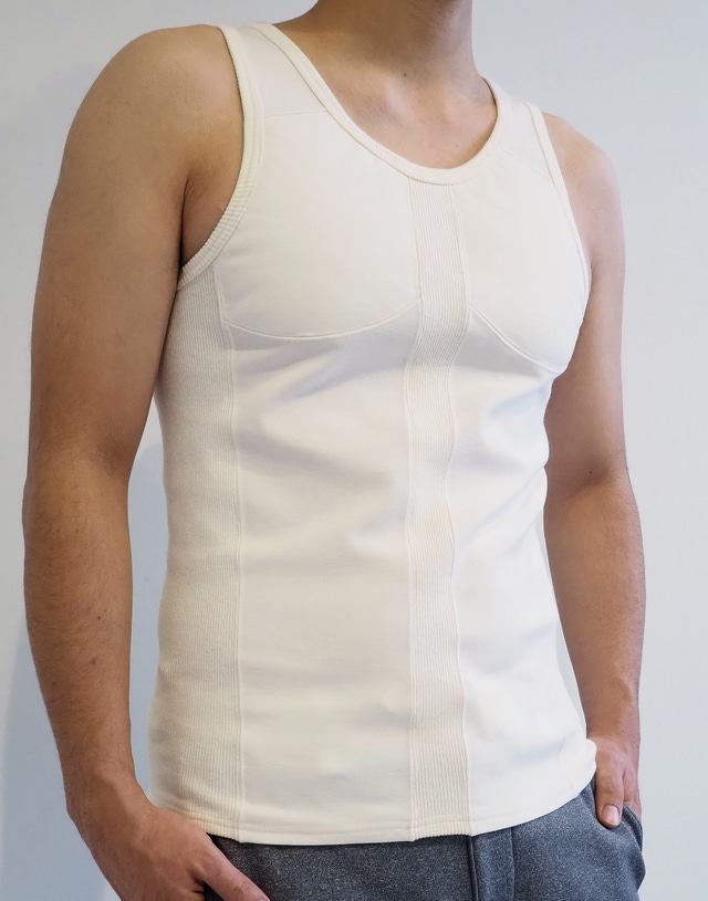 当製品は、胸部分にのみ中綿(なかわた)を入れる事によって胸板に厚みを持たせ、着用した時にたくましい胸板を形作る事を意図した製品です。そして中綿なので温かい。つまりは体型と温活を同時にサポートする、そんなインナーです。