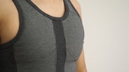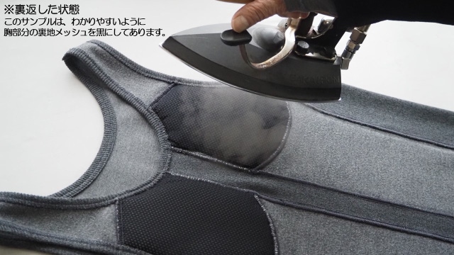 製品がお手元に届いた際、もしかしたら「思ってたよりも胸部分にが厚みがあるな」と感じるかもしれませんが、着用すると中綿が馴染んで適度な厚み(約5mmほど)になります。また、お洗濯後は中綿が圧縮されてやや薄くなります。中綿をふっくらさせたい場合は、服を裏返していただき胸部分の裏地側(胸部分の裏地はメッシュ生地になっています)からアイロンの蒸気を吹きかけた後に吊り干ししていただくと、中綿がふっくらします。