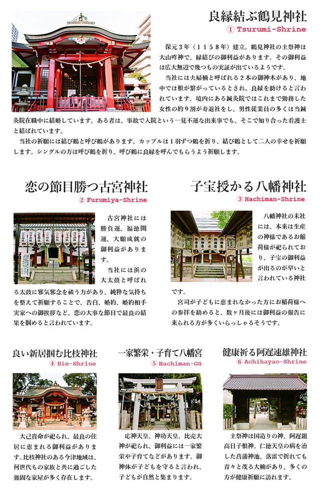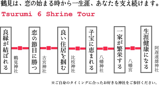 そして鶴見の特徴的なところは、6神社を巡れば良縁、恋の勝負、家庭円満、健康長寿と、出会いから人生の終わりまでの御利益が揃っているのです。1度でも来れば非常に安心した気持ちでお帰り頂ける場所です。