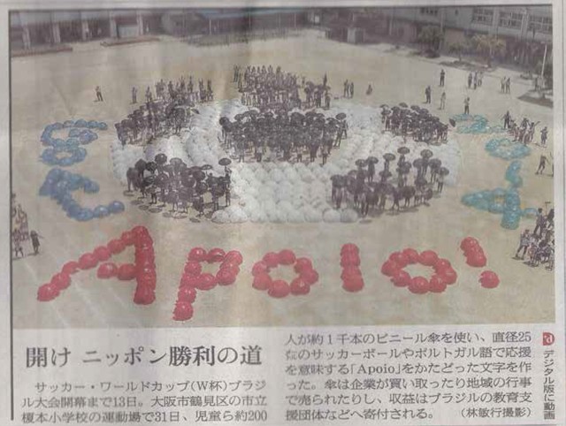 【上記は朝日新聞】梅雨の時期なのでサッカー・ワールドカップを傘で応援することに。傘は千本ほど用意し、地域の皆様に買い取ってもらうことで、その収益金をブラジル、ガーナ、日本サッカー協会に寄付しました。