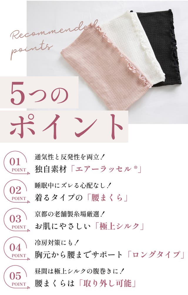高反発性・通気性・耐久性に優れた「腰まくら」としての機能性に加え、「呼吸する繊維」とも呼ばれるシルクならではの滑らかな肌触りを誇る「素材感」、そして、胸元から腰までを包み込むロングタイプとしたことでの、通年を通しての「使い勝手」。