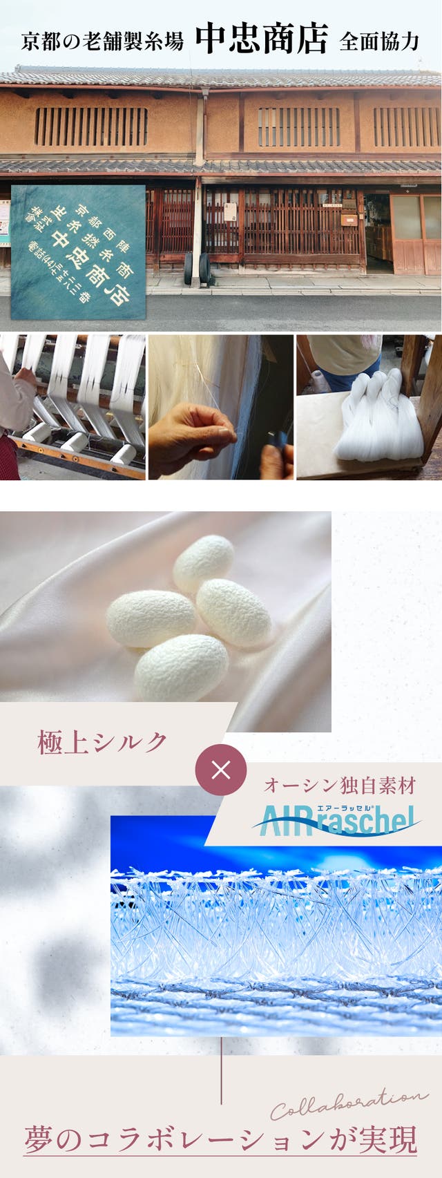 京都西陣の老舗製糸場「中忠商店」の全面協力をいただき、腹巻き部分には厳選した極上シルクを採用。