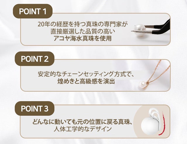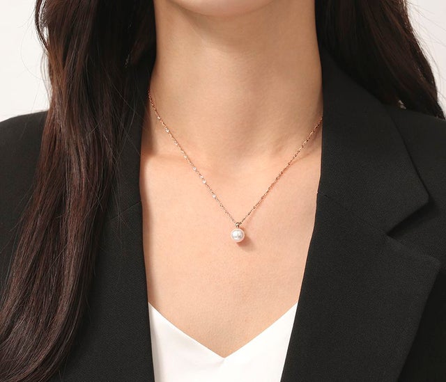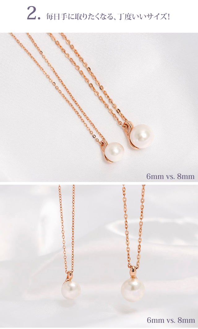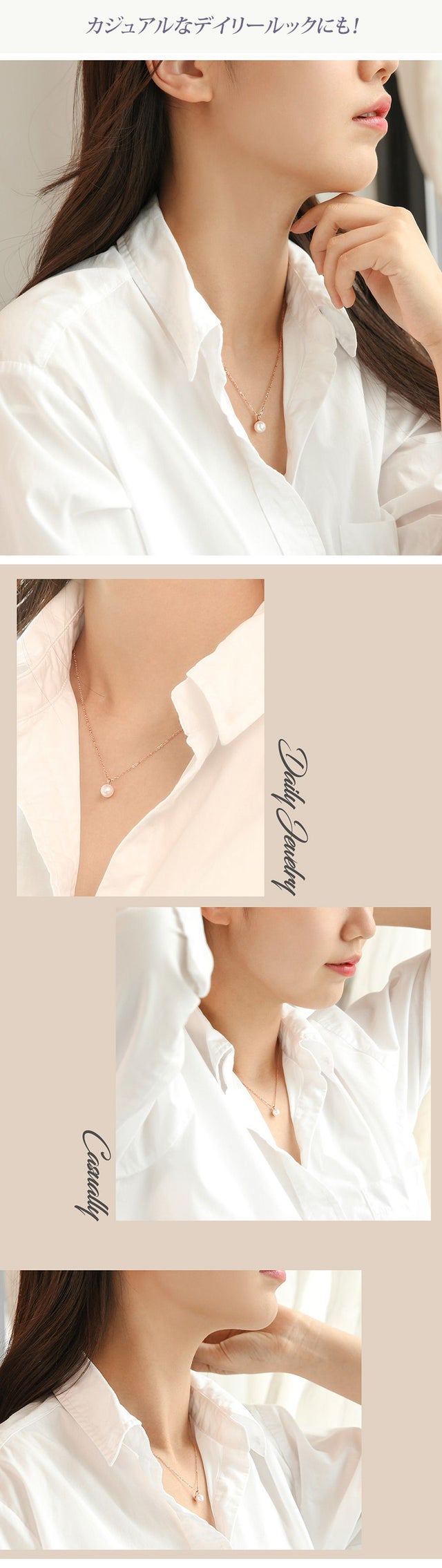 アコヤ真珠ネックレスは、デイリー使用にも、ドレスアップが必要な特別な日にも、無難でありながらエレガントさをプラスできる高級感溢れる真珠を使用しました。また、滑らかで美しい光沢を放つ真珠を目立たせるため、無駄を最小限に抑えシンプルなデザインにしました。