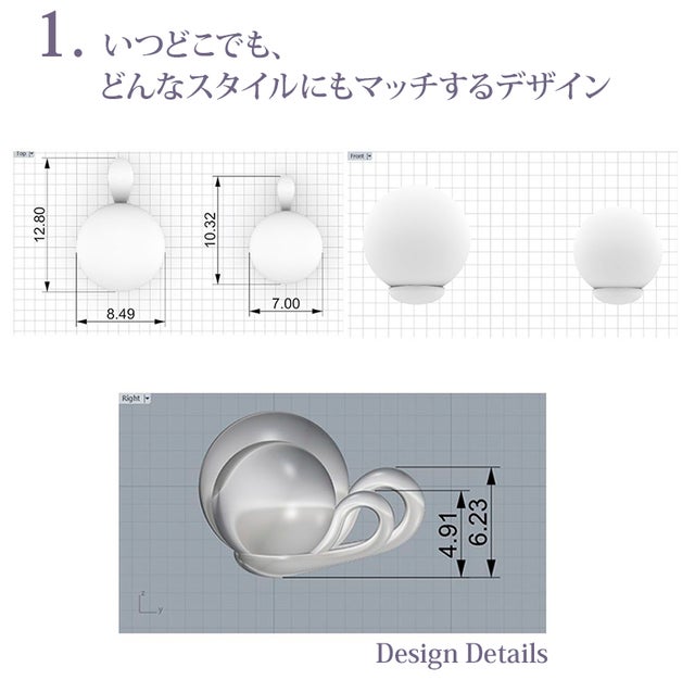 真珠の直径を指します。一般的に品質が同等ならば、真珠が大きければ大きいほど値段が上がっていきます。真珠は大きさによって価値が上がりますが、ただ大きいからと言って良いものであるとは限りません。いつどこでも気軽につけられるちょうどいいサイズ、6mm/8mmの二つのサイズをご用意しました。