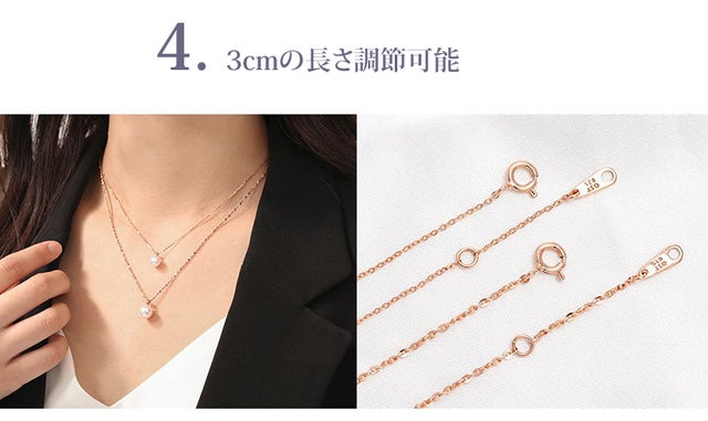 着用しやすい引き輪のネックレスは微妙な長さの違いによって雰囲気が変わってきますよね。服のネックラインによって違った雰囲気を演出できるように3cmの長さ調節ができるアジャスターカンを付けました。