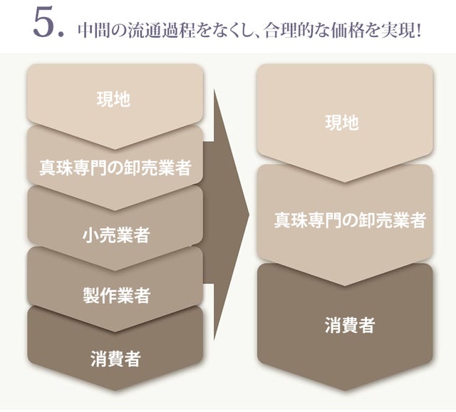 いくつかの流通段階を経るたびに、真珠ジュエリーの価格はだんだん上がっていきます。私たちが直接足を運ぶことで流通段階を大幅に減らし、サポーターの皆さまに合理的な価格で提供・お届けできるのです。