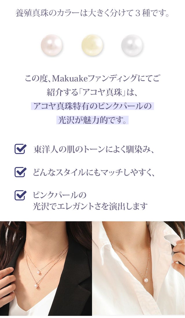 初めまして、株式会社OST事業部の担当の者です。私たちは30年間、ジュエリー業界で持続的にジュエリー製品を生産してきました。女性ならば誰でも一つは持つべき真珠、その中でも価値の高いアコヤ真珠を多くの人につけてもらいたいという想いから企画に至りました。真珠のブランドの中では基本的な真珠のネックレスだけでも10万円相当の値がつけられますが、Makuakeではなんと7000円台でアコヤの真珠を堪能することができます。