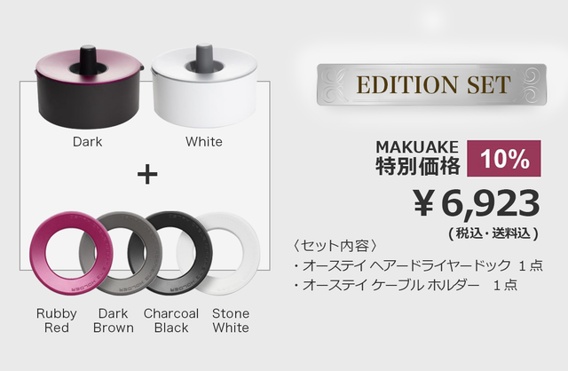 ・本製品にはダイソンヘアードライヤー本体とアタッチメントは含まれておりません。 ・壁面設置(壁掛けスタイル)時、両面テープなどの設置での不具合は保証外となります。 ・並行輸入品及び個人輸入販路によっては防ぐことができない可能性がある点、ご了承お願います。 ・メーカーでは量産体制を整えておりますが、想定を上回るご支援を頂ける場合に、出荷時期が遅れる場合もあります。 ・製品デザインや仕様が一部変更になる場合もあります。 ・生産効率の向上や量産体制が整い、正規販売価格が販売予定価格より下回る可能性もあります。 ・カラーなどの色合いが、ディスプレイの見え方で違って見える場合があります。 ・ご支援後のご支援者様都合によるキャンセルや返金は受付致しませんので、ご了承ください。