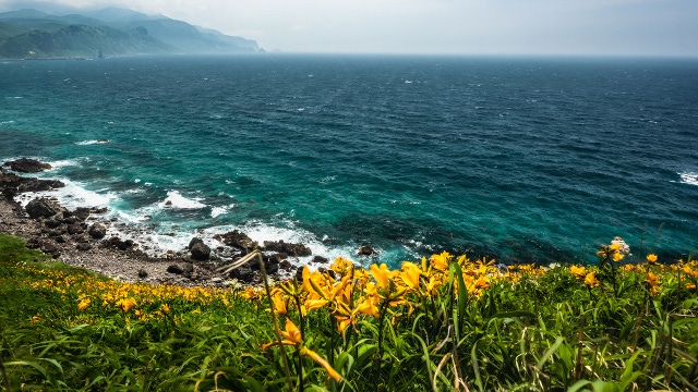 その美しい積丹ブルーに咲き誇る「エゾカンゾウ」をシーブルーカルセドニー/イエローサファイア/ペリドットで表現しました。