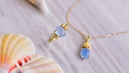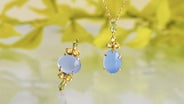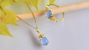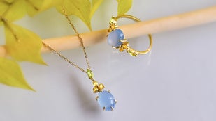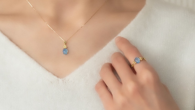 ボリュームのあるシーブルーカルセドニーが、手元、胸元を美しく演出