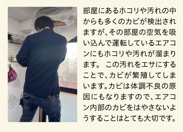 フィルター内に溜まったホコリにカビや雑菌の繁殖を抑制するので、エアコンの排気で再びウイルスや雑菌がお部屋に広がるのも徹底的に防ぎます。