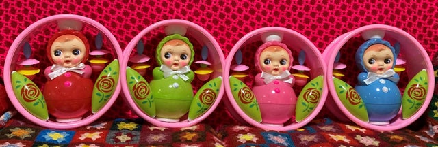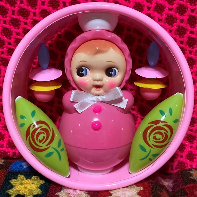 昭和の最盛期には、新生児期から与えることができるおもちゃとして人気となり、複数のメーカーから様々なデザインや表情・模様が描かれた起き上がりこぼしが販売されておりました。今でも、現代風デザインなどで一部販売されております。