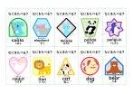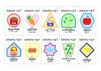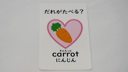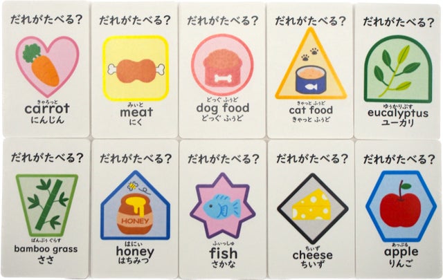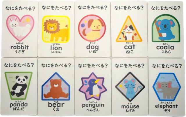 遊べるカードは動物10種類と食べ物10種類の全20種類あり、すべてのカードに動物(食べ物)の名前と英単語、読みがついています。