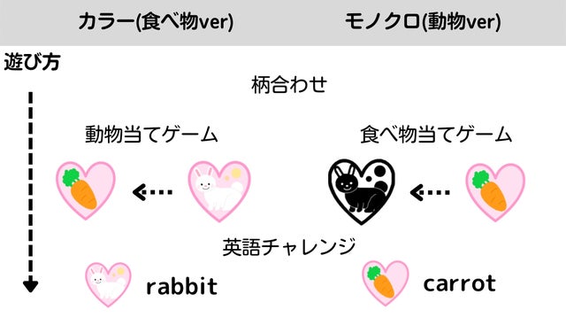 また、Tシャツのデザインはカラー(食べ物ver)とモノクロ(動物ver)の2種類作成しており、遊びの進行が変わる工夫を凝らしました。