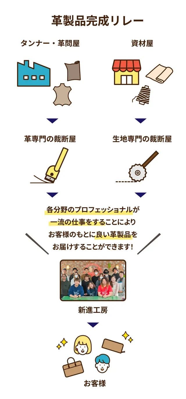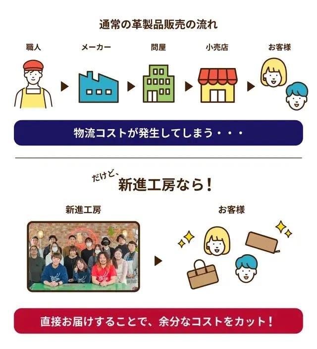 通常、革製品がお客様の手に届くまでに多くの中間マージンや物流コストが発生しています。それに比べて新進工房の仕組みはシンプルです。