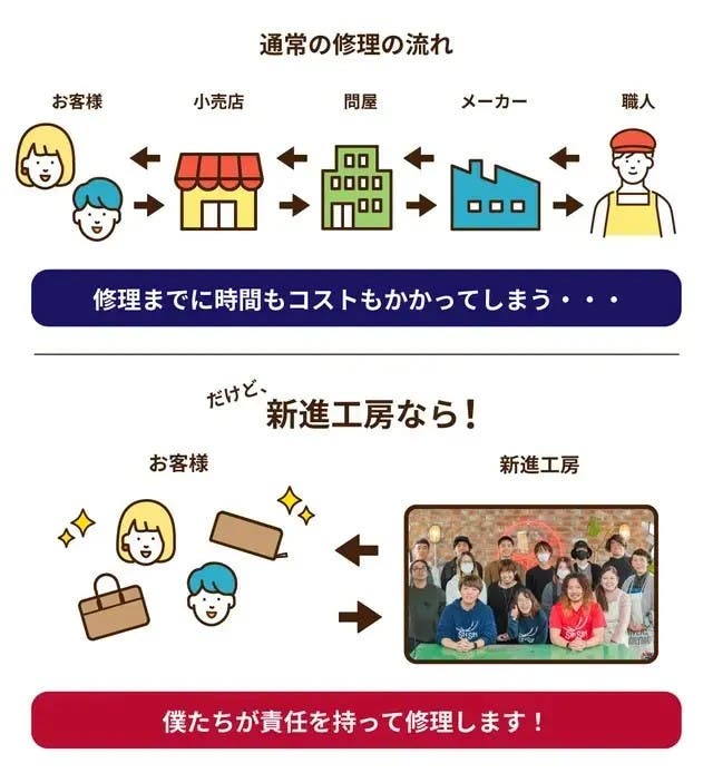 革製品の修理の流れは先ほどと逆の流れになるので修理までに時間がかかり、間に多くの人が介在するので無料で修理を受けていないところが多いのが実状です。新進工房はお客様との間に人が介在しないので通常の流れに比べて修理の時間が短くできます。