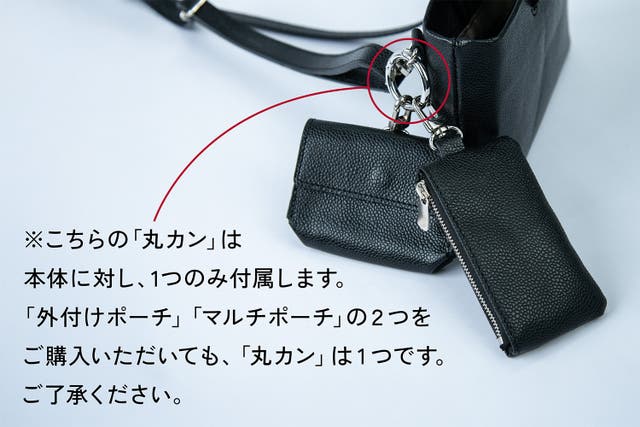 本体のご購入1つに対し、外付けポーチとマルチポーチの両方をご購入された場合、丸カンは1つのみの付属になりますので、ご了承くださいませ。