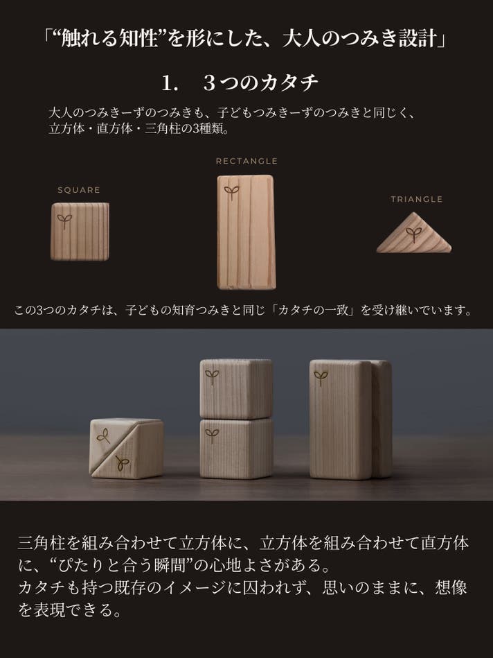 「遊びながら学ぶ」をモットーに、赤ちゃんから使える知育つみきブランド〈つみきーずのつみき〉が、大人のためのつみきを開発。