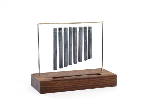 8本の異なる音色のサヌカイトを丁寧に切り出し、卓上型のチャイムに仕上げました。