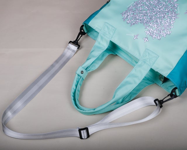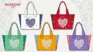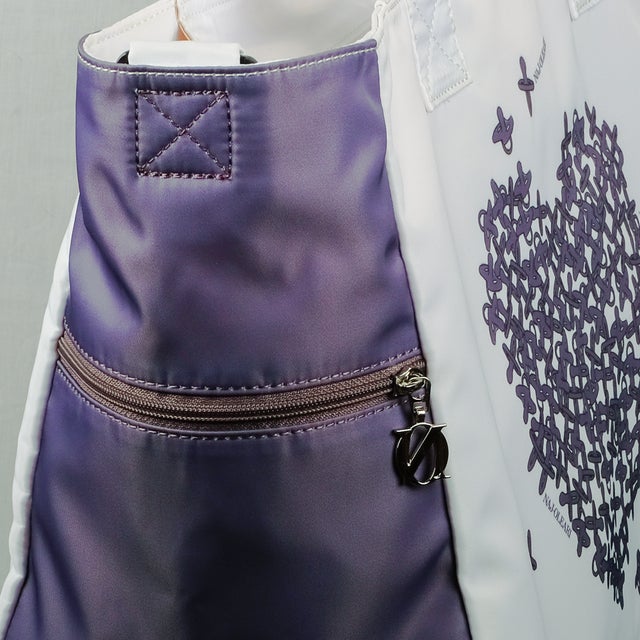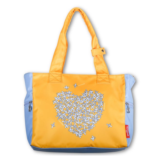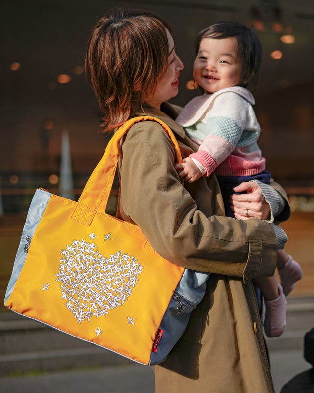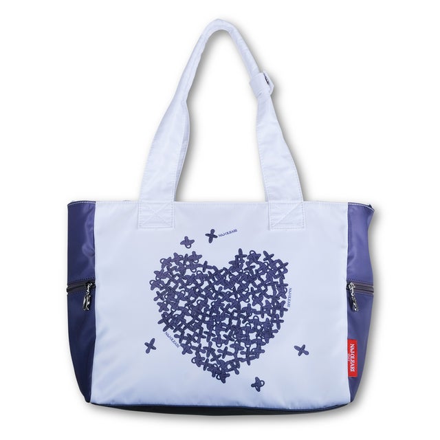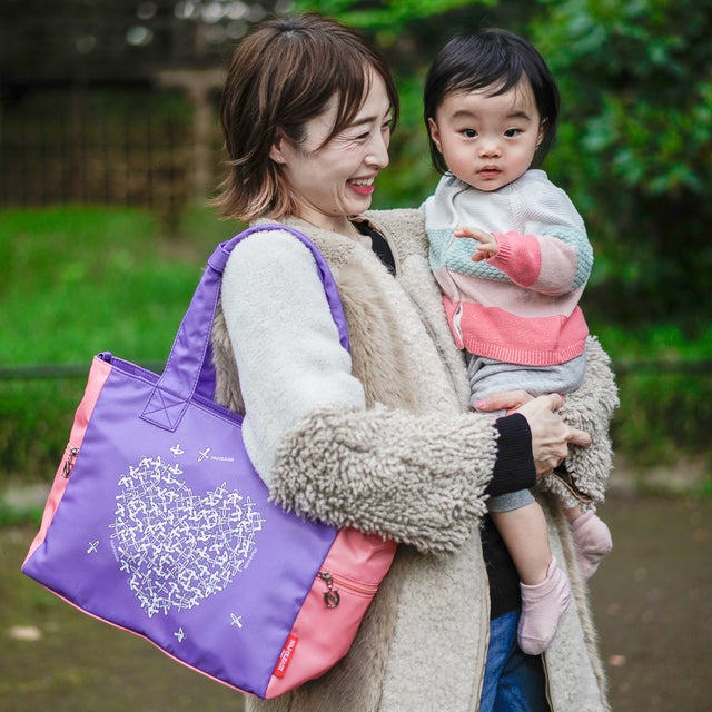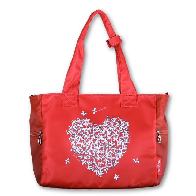 今回のプロジェクトではナヨレアーリのデザインの中でも際立って楽しく、マザーズバッグに最適なグラフィックを使用。バッグ側面にあしらった大きなハート柄はおしゃぶりが集まってハートの形になっています。