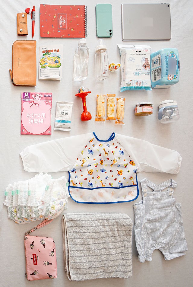 収納容量は約16リットル、マチは余裕の20cm。紙おむつを折ることなく収納します。例えばこれだけのものが収納できます。