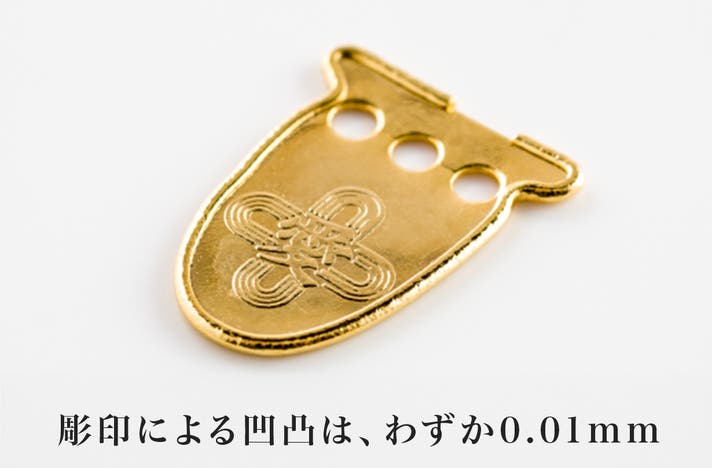 厚さ0.3mmの真鍮に刻印を打つことで、指で触ってもわからない程度の0.01mmの凹凸が生まれます。ちなみに、片面にのみ刻印する技術を有しているのは、日本で当社をおいて他にありません。
