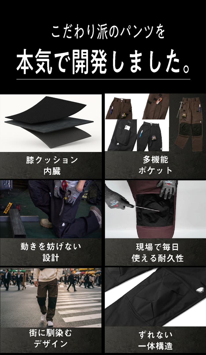今回のワークパンツは、膝クッションという「機能」と、街に馴染む「デザイン」を極限まで追求しました。この1本が、あなたの趣味の時間や日々の生活をより豊かで快適なものに変えると確信しています。