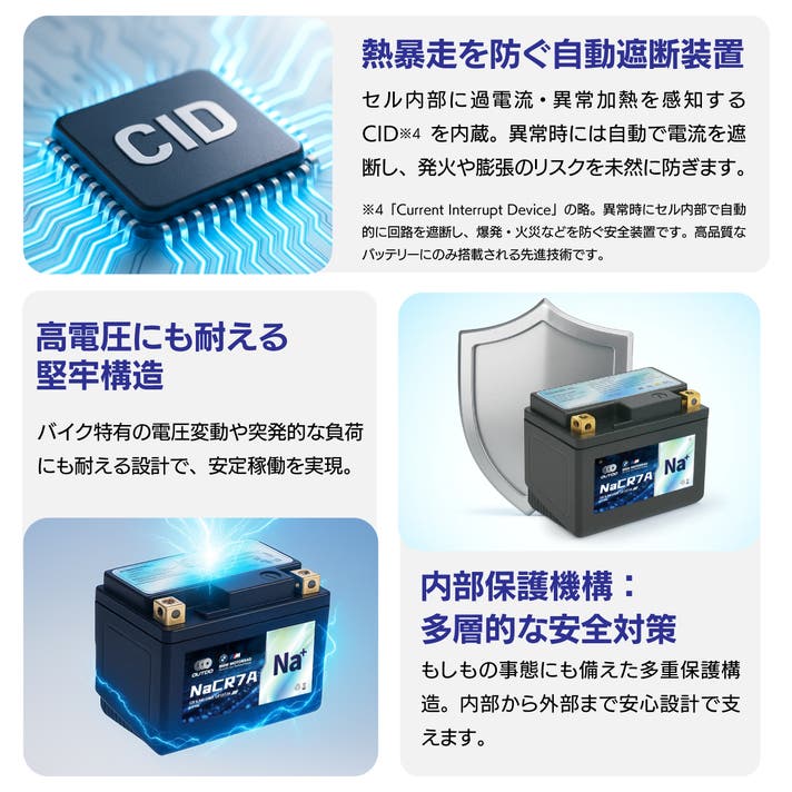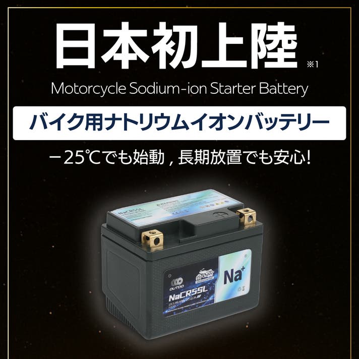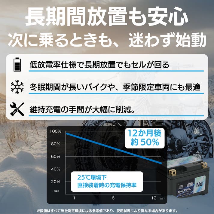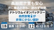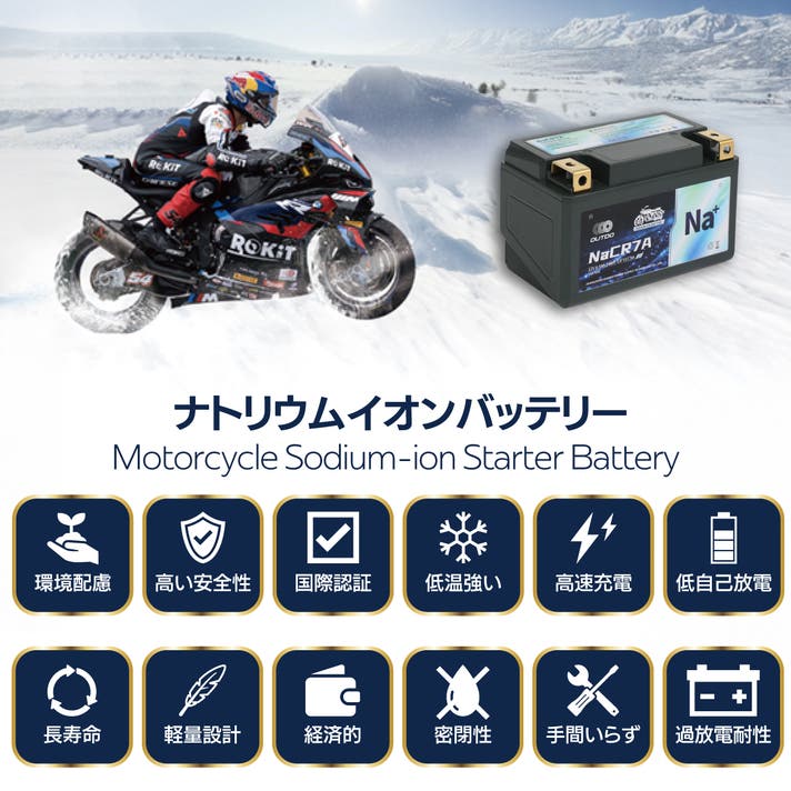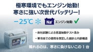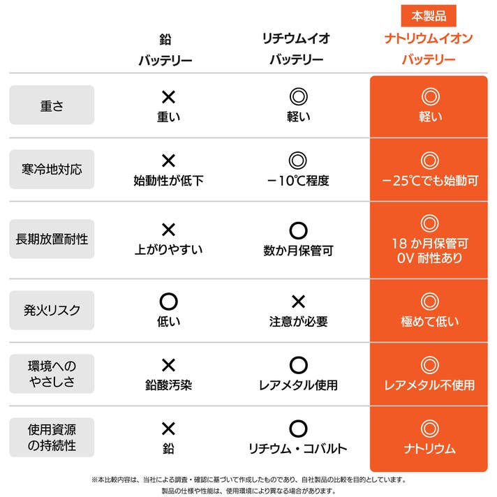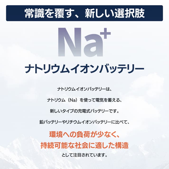 ナトリウムイオン電池は、環境負荷が少なく、資源の持続性にも優れた“地球にやさしい”新技術。しかも、−25℃の寒冷地でもエンジン始動が可能な高性能。さらに、自己放電が少ないため長期放置にも強く、発火リスクも極めて低いという、まさに理想のスペックを備えています。