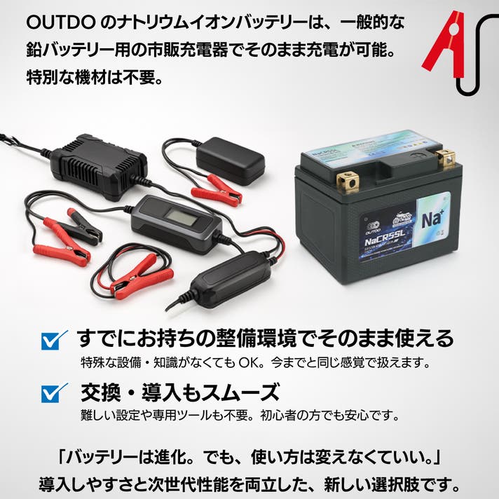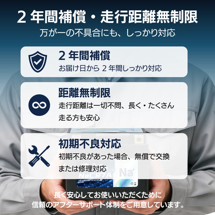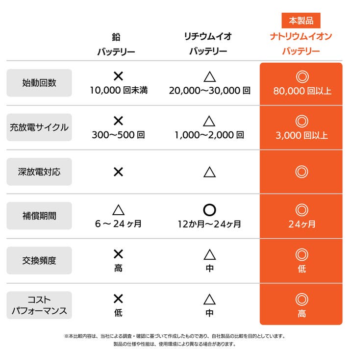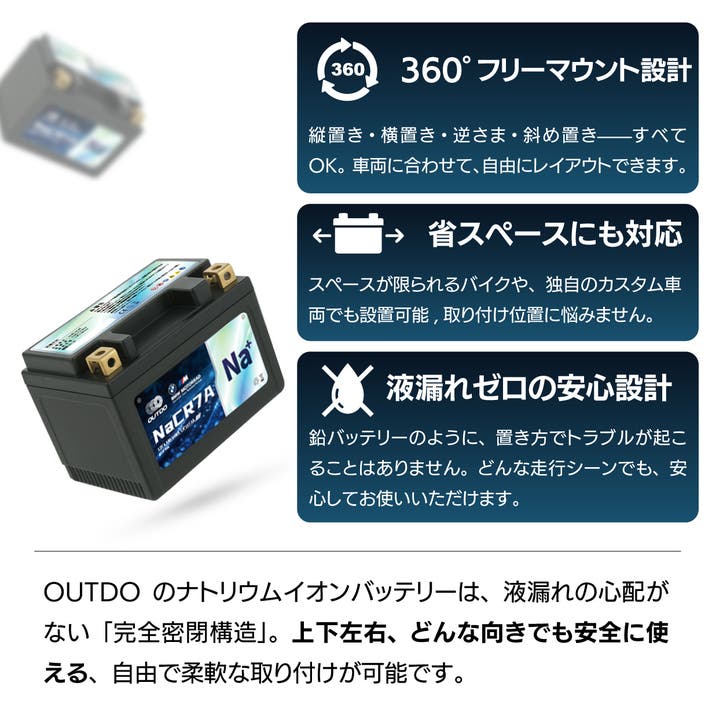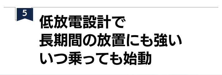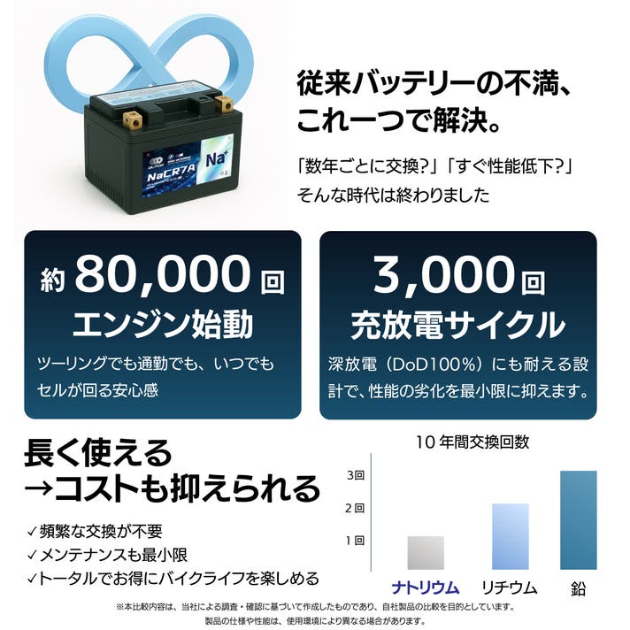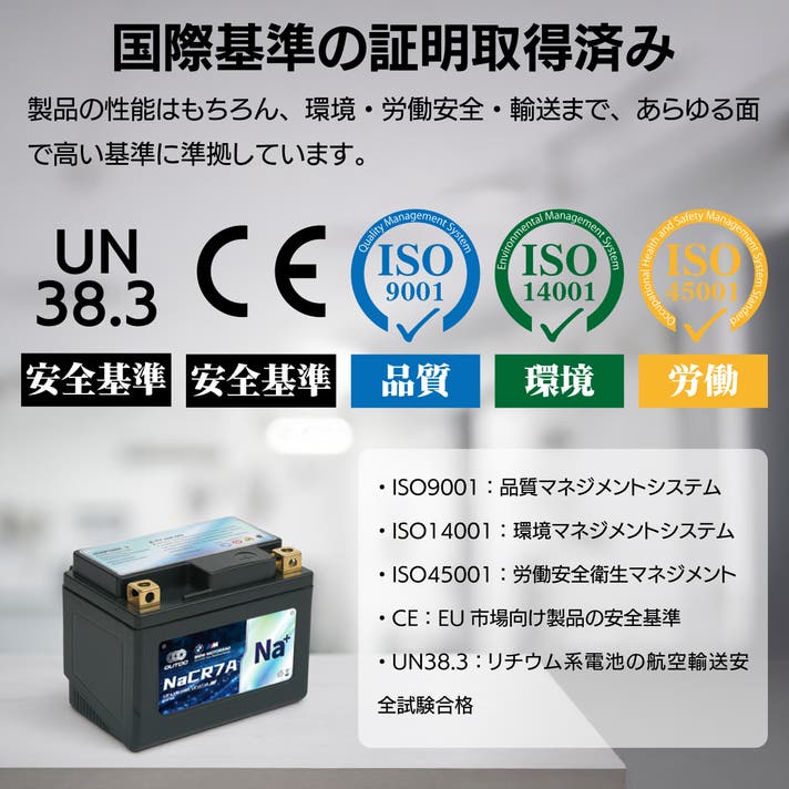 ナトリウムイオン電池は、環境負荷が少なく、資源の持続性にも優れた“地球にやさしい”新技術。しかも、−25℃の寒冷地でもエンジン始動が可能な高性能。さらに、自己放電が少ないため長期放置にも強く、発火リスクも極めて低いという、まさに理想のスペックを備えています。