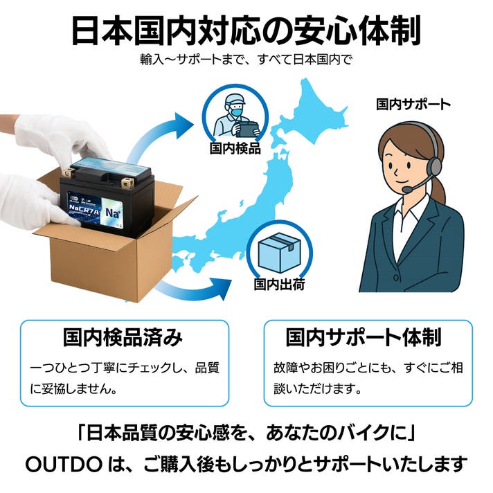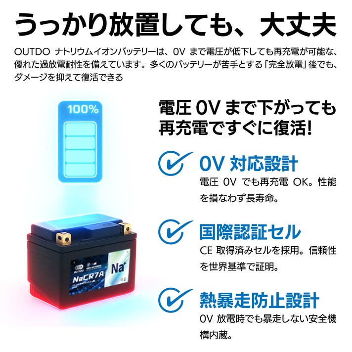 私たちは、そんな不満や不安を解消できる次世代バッテリーを探し求め、辿り着いたのがOUTDO社製のナトリウムイオンバッテリーでした。