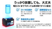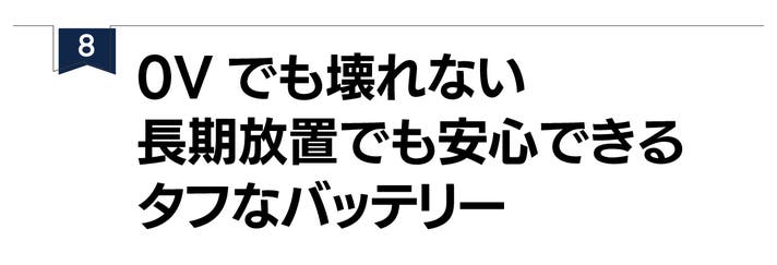 - 低放電設計で、長期保管にも対応。フル充電なら最長18か月間そのまま保管が可能