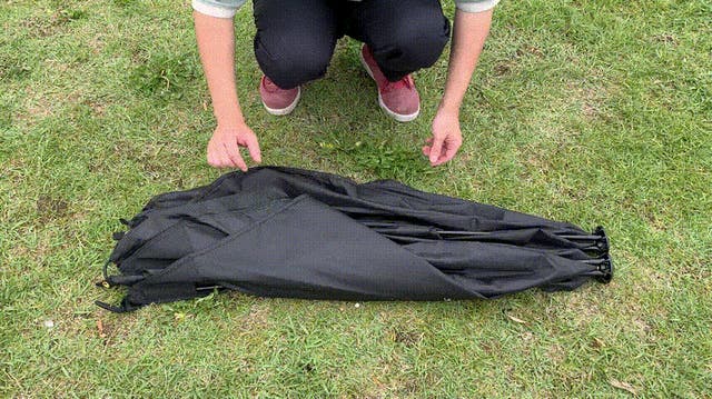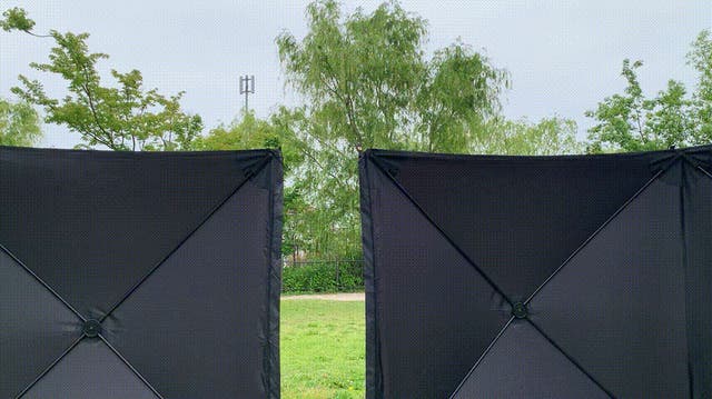 2.それぞれ2枚の陣幕の骨組みを傘のイメージで押して固定させ、立てると完成になります!