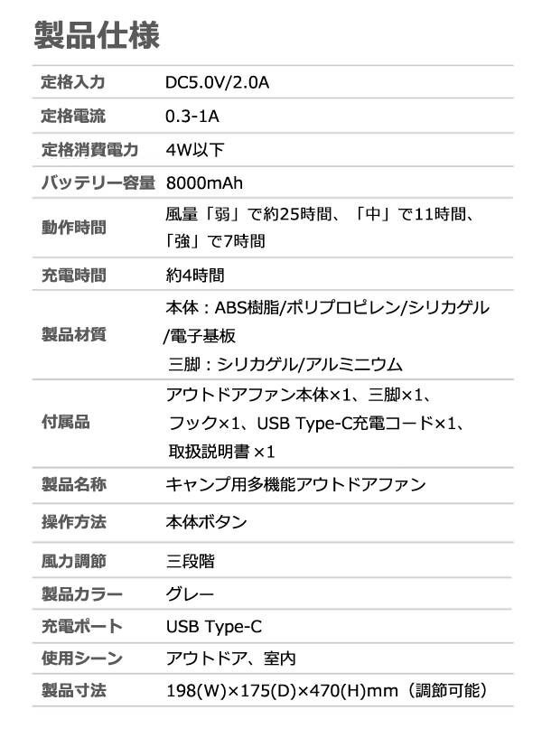 製品質量はわずか800g!コンパクトに収納できるので、アウトドアでもオフィスでも、どこにでも気軽に持っていけます。さあ、今年からコードレス多機能アウトドアファンを使って、アクティブな夏をエンジョイしましょう!