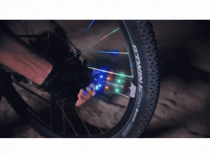 車輪の回転に合わせて青・緑・赤の光がダイナミックに躍動し、夜の走りを鮮やかに演出。