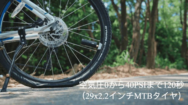 マウンテンバイクタイヤ(29×2.2インチ)の空気を継ぎ足す場合、わずか50秒で完了。