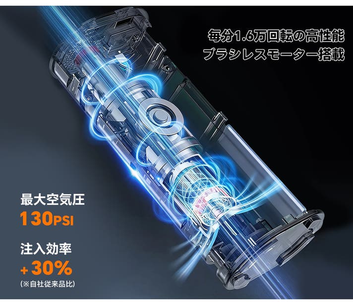 その秘密は、「独自の気流システム」と「高効率ブラシレスモーター」にあります。 エネルギー損失を抑え、効率よく力強い空気をタイヤへ! 「130PSI」の高圧設定が可能で、ロードバイクのタイヤケアにも頼もしいスペックを実現。 ゆとりある設計だからこそ、日常の空気入れも驚くほどスムーズです。