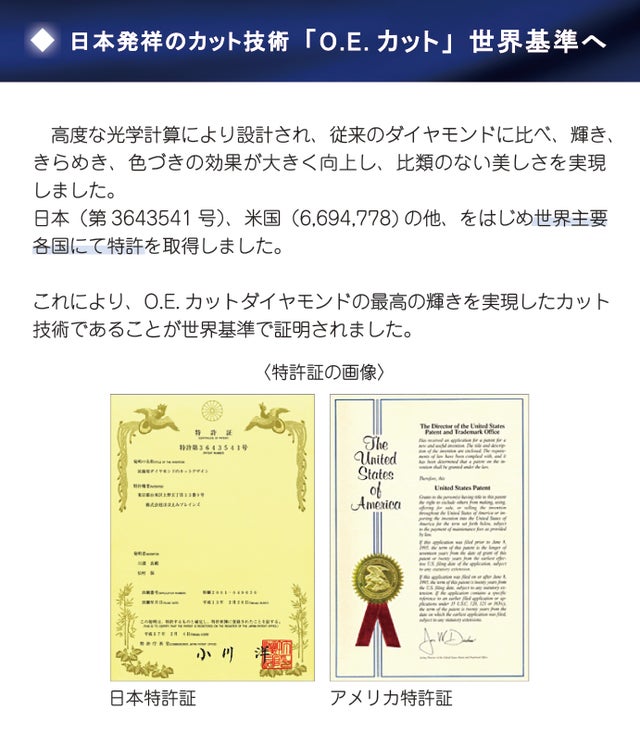 このページをご覧いただきまして、誠にありがとうございます。本プロジェクトは、日本で開発され、世界各国で特許を取得した「O.E.カットダイヤモンド」を広く周知していただく為に、立ち上げさせていただきました。