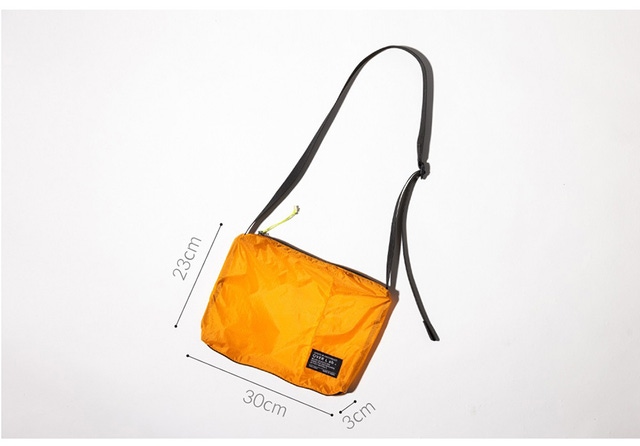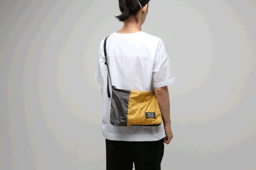 パラグライダーの素材は原糸長さ100メートルの重さ30グラムという、非常に細い糸で作られており(ナイロン66番30デニール原糸)、1ヤードに38グラムの非常に軽いダブルリップストップ(double ripstop)生地です。 ダブルリップストップは連続的な破れ防止のための構造でもあります。パラグライダー素材のまま作られているので、サコッシュバッグは軽量感、丈夫さ、生活防水などの特性があります。