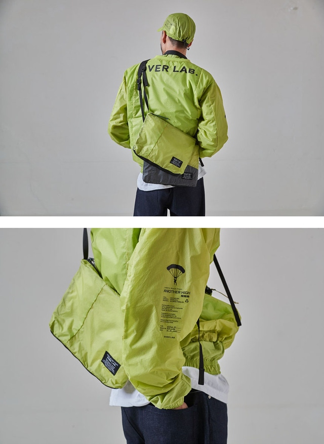 パラシュート生地だから!アナザーハイサコッシュバックは、レジャースポーツ素材の持続可能性を目指すプロジェクトです。2023年に発売された、爽やかなカラーのOVERLABのサコッシュバックシリーズです。
