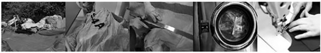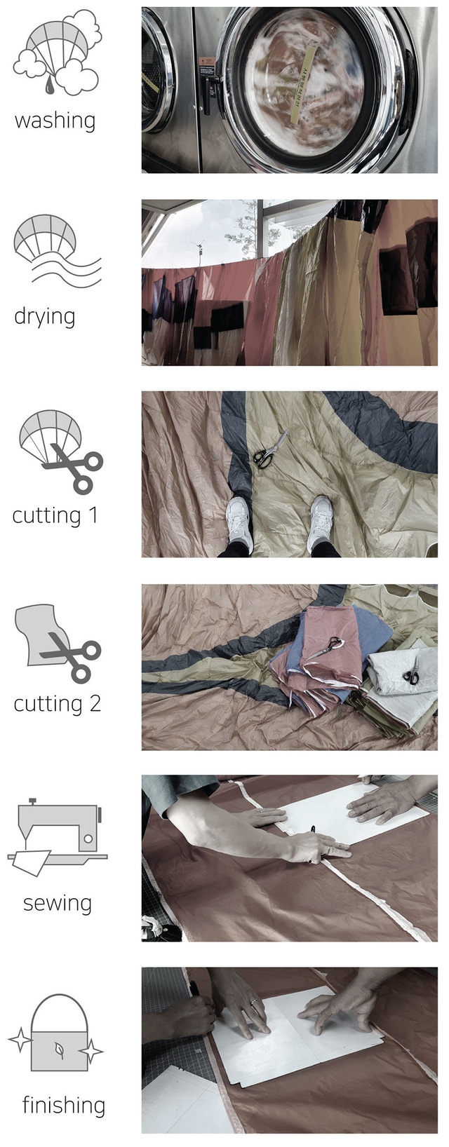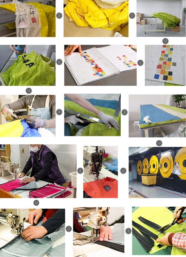 丁寧に裁断して洗浄し縫製します。アップサイクリングには、新しいアイテムを誕生させるための事前作業にかなりの労力と時間が必要です。パラグライダーの分解と洗濯、そして工場で簡単に裁断するための1次裁断作業。この過程ではシニア人材を動員して作業しました。