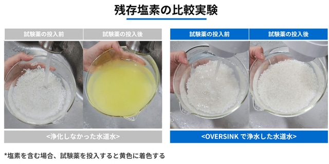 OVESRSINKによる浄化後の水道水では、塩素試験で黄色く呈色しませんでした。