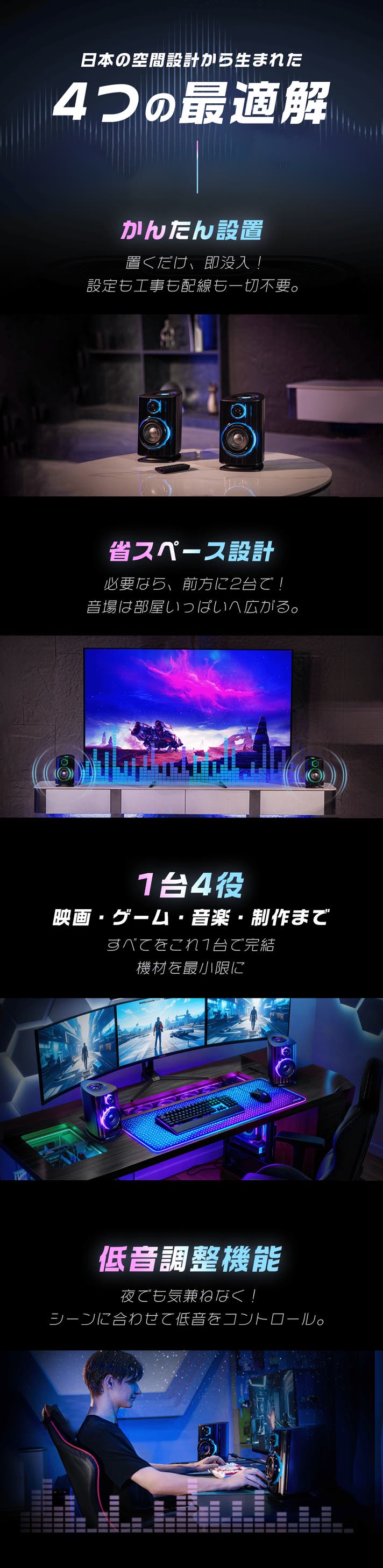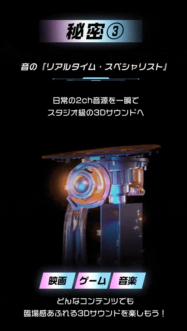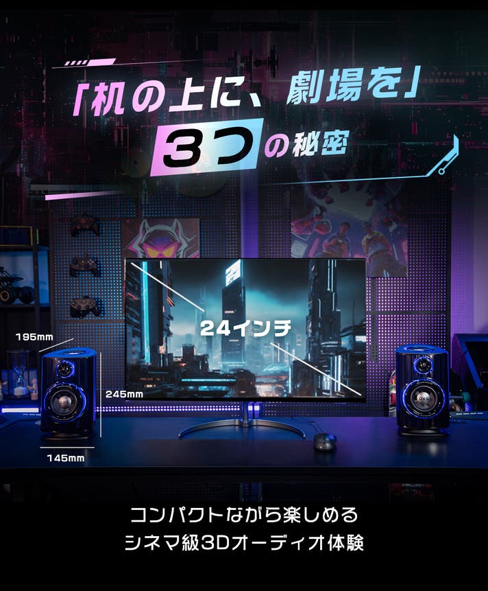 天井にスピーカーを設置したり、複雑なサラウンドシステムを組んだりするなど面倒なことは一切不要!デスクに置くだけで本格的な3Dオーディオ環境が完成。