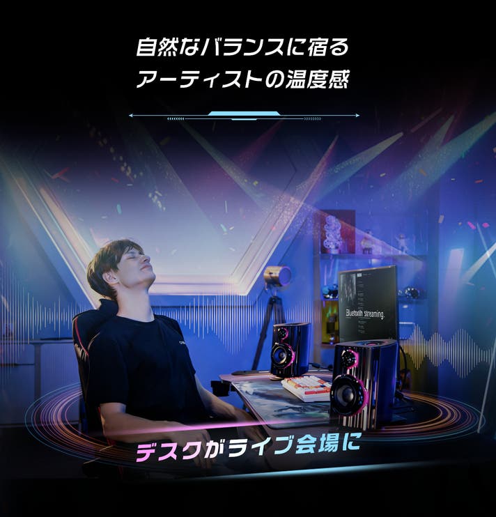 複雑な設定や大掛かりな設置を必要としません。デスクに置いて接続するだけで、すぐに立体音響を体感できます。PC、PS5、Xbox、Switch、モバイルなど幅広いデバイスに対応。ゲームから映画、音楽、制作まで、1台で柔軟に活躍します。