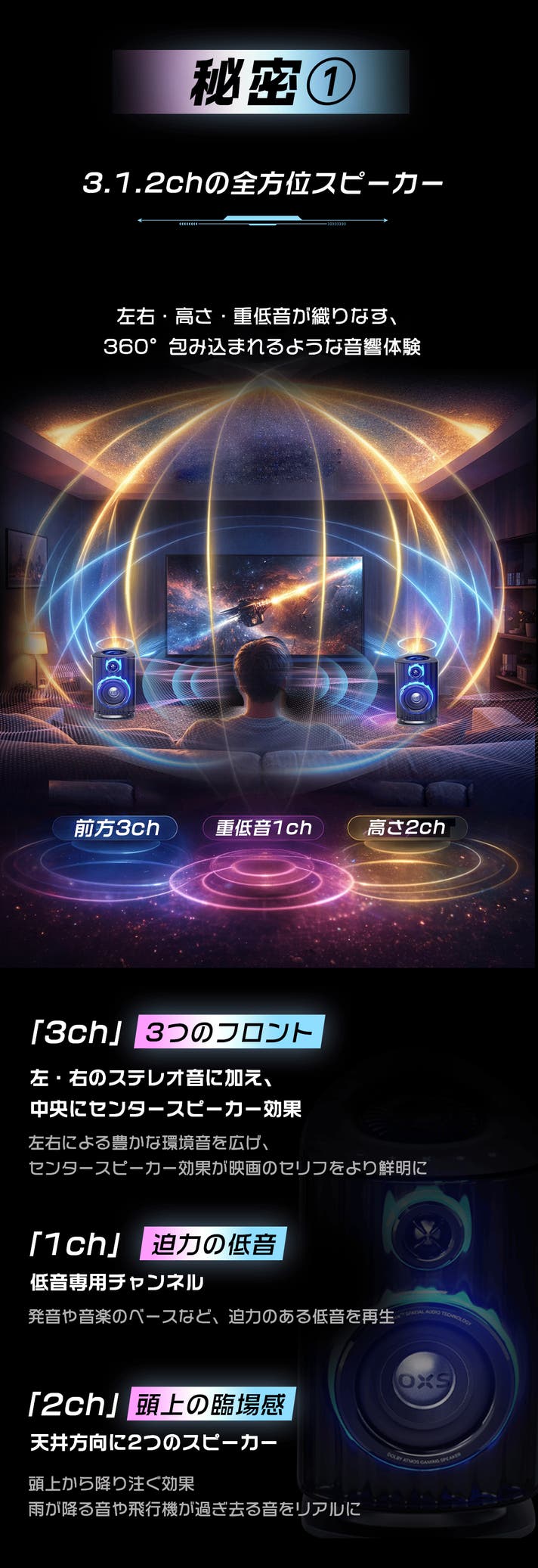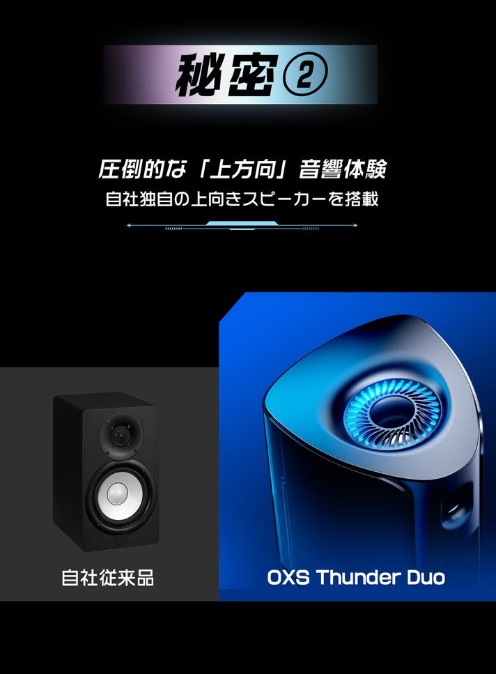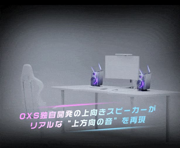 従来のデスクトップスピーカーは、音を正面にしか飛ばせないため「上からの音」を再現することは困難でした。OXSは自社独自設計の「上向きスピーカー」を搭載し、音を天井に反射させることで雨音やヘリの音など、頭上から降り注ぐ音響をリアルに再現!