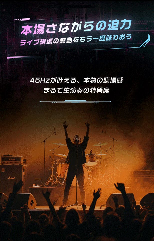 45Hzまでの重低音でベースやバスドラムなどの低音域がしっかり再現され、ボーカルの微細な振動や胸の共鳴まで届く。
